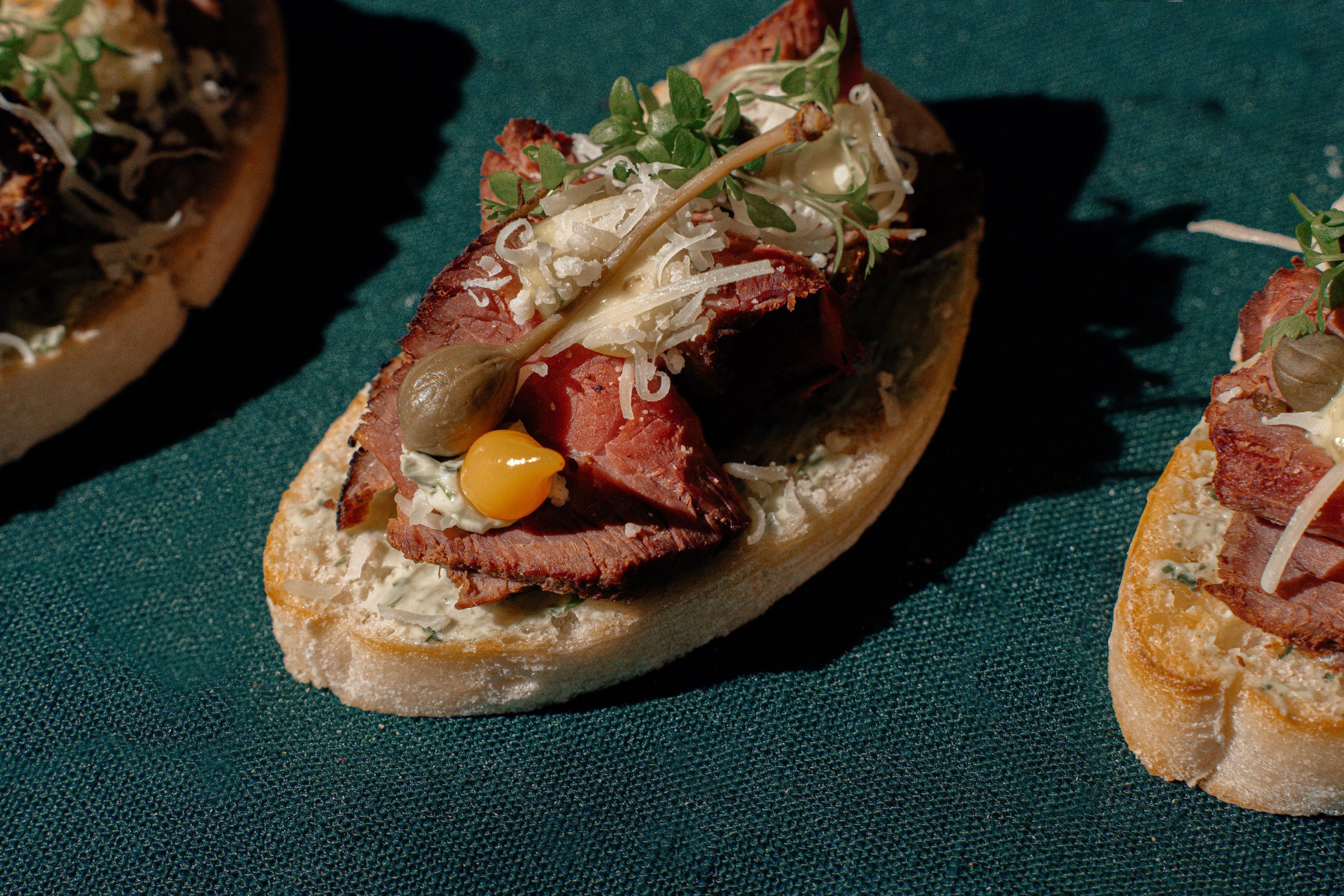Brusketa su žolelių sviestu, rūkytu jautienos roastbeefu ir kaparais ir lašeline paprika