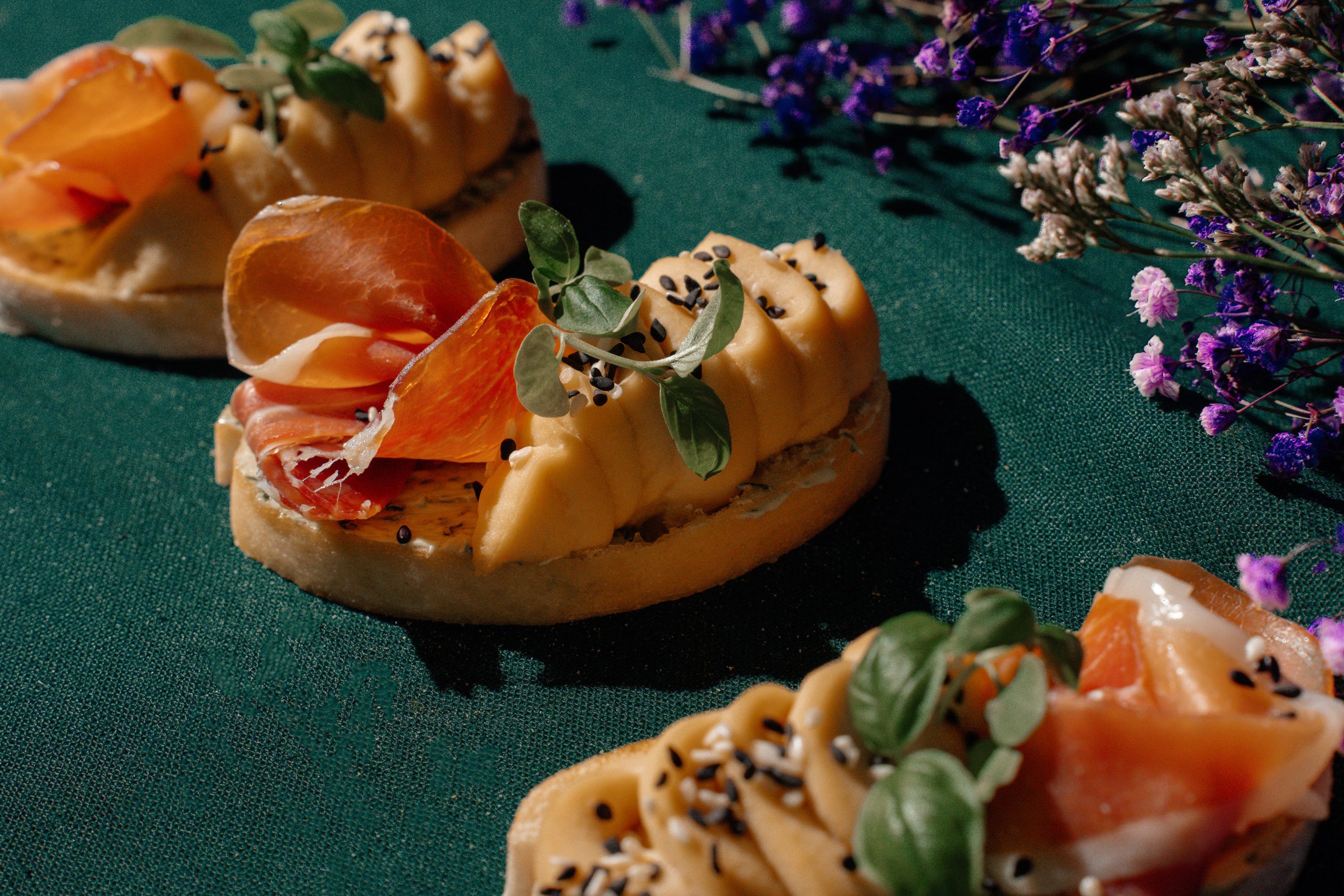 Brusketa su žolelių sviestu, Serrano kumpiu ir naminiu humusu ir kepintomis sezamo sėklomis