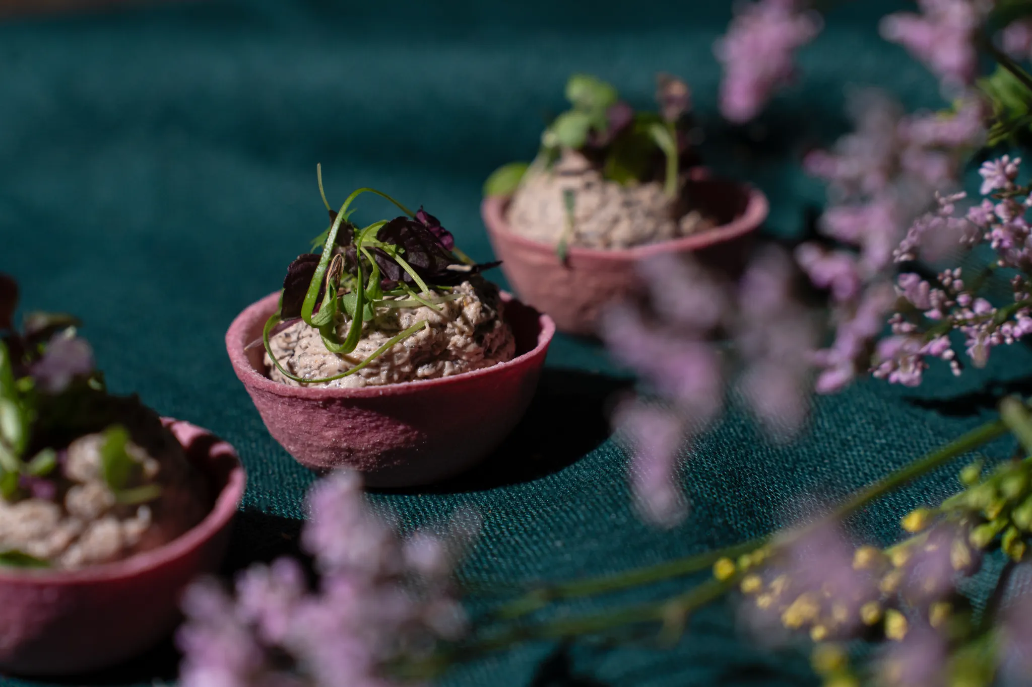 Krepšelis su keptų grybų kremu dehidratuota alyvuogių žeme bei mikrožalumynais