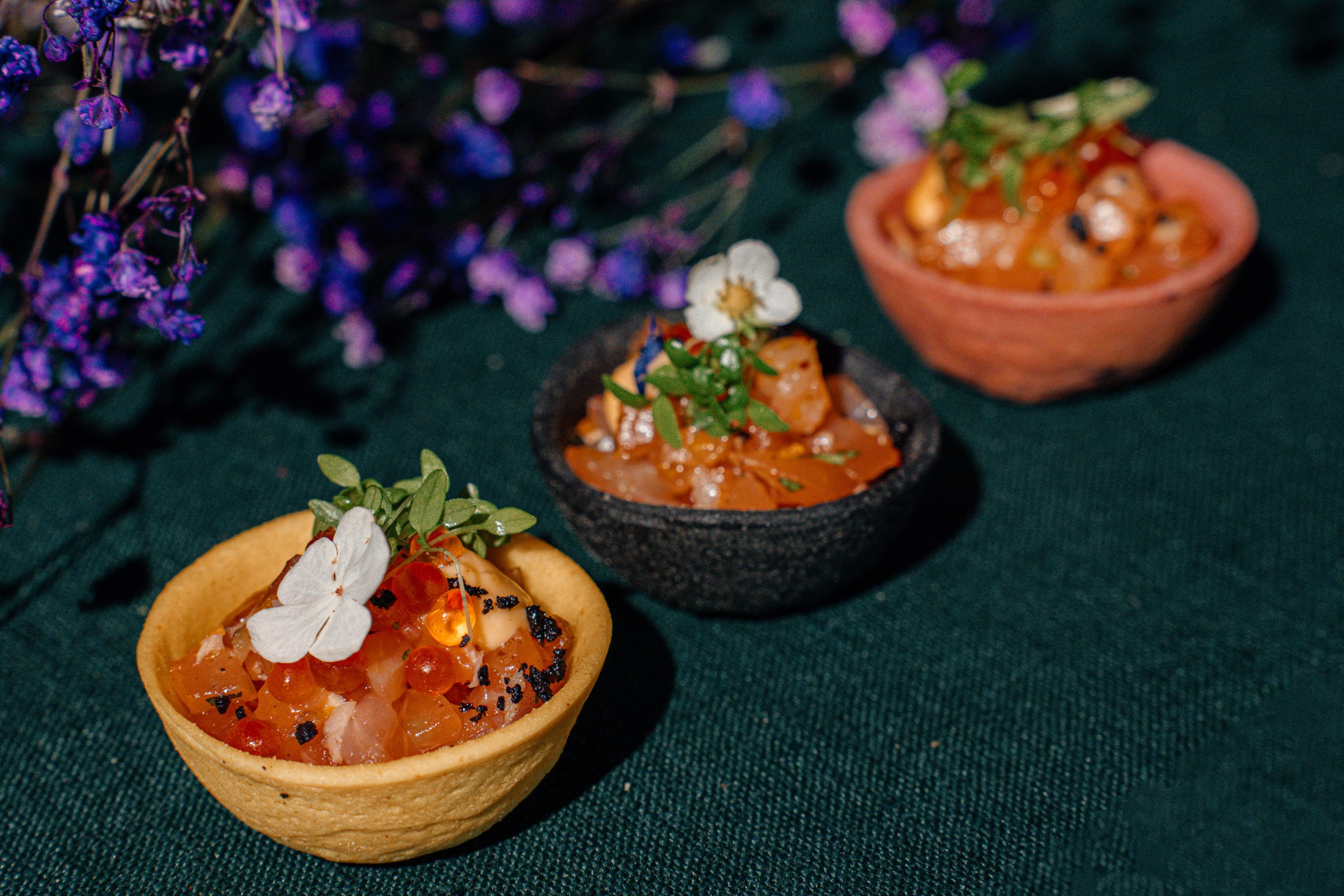 Krepšelis su lašišos kapotiniu, šalotais, pankoliais, naminiu kimči majonezu ir upėtakio ikrais