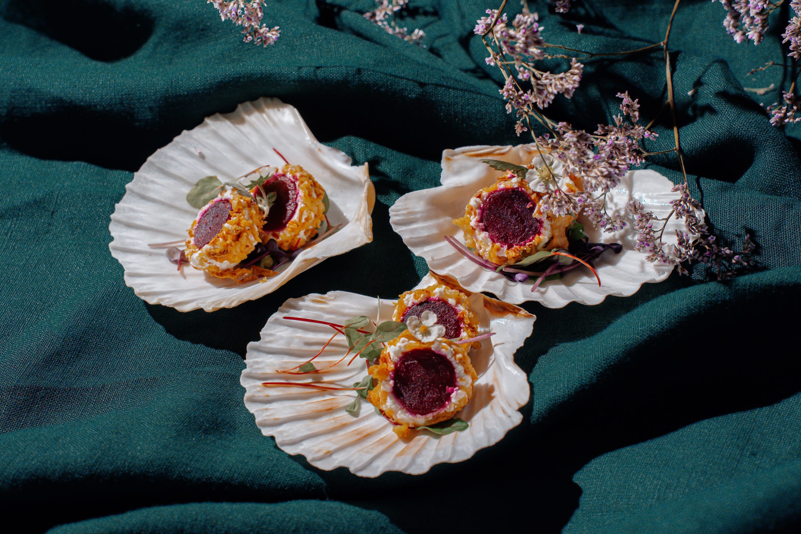 Ožkos sūrio perliukai įdaryti rūkytu burokėliu su grūzdintais svogūniukais