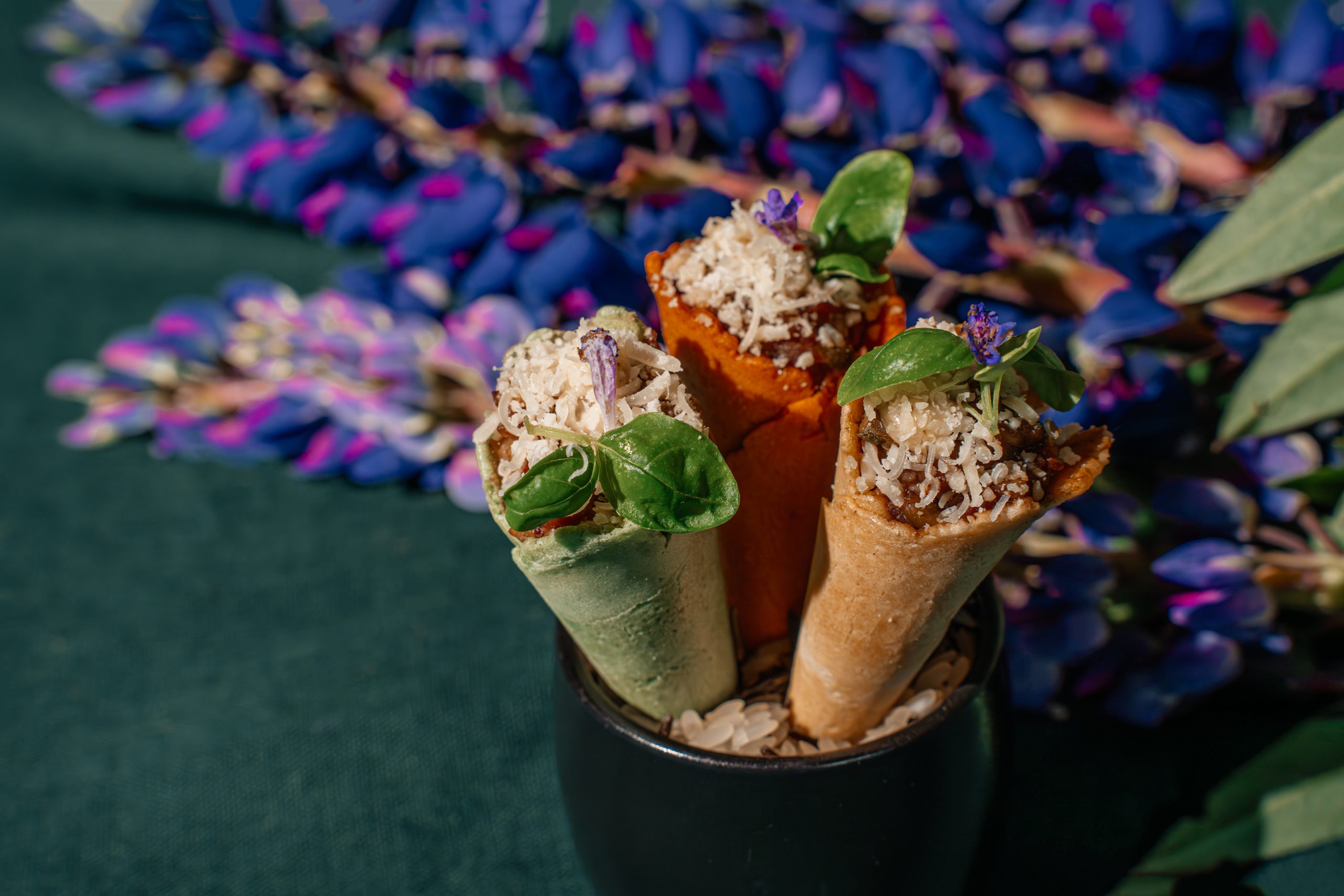 Spalvoti vafliukai kūgeliai su jautienos kapotiniu, kaparėliais ir parmezano sūriu ir mikrožalumynais