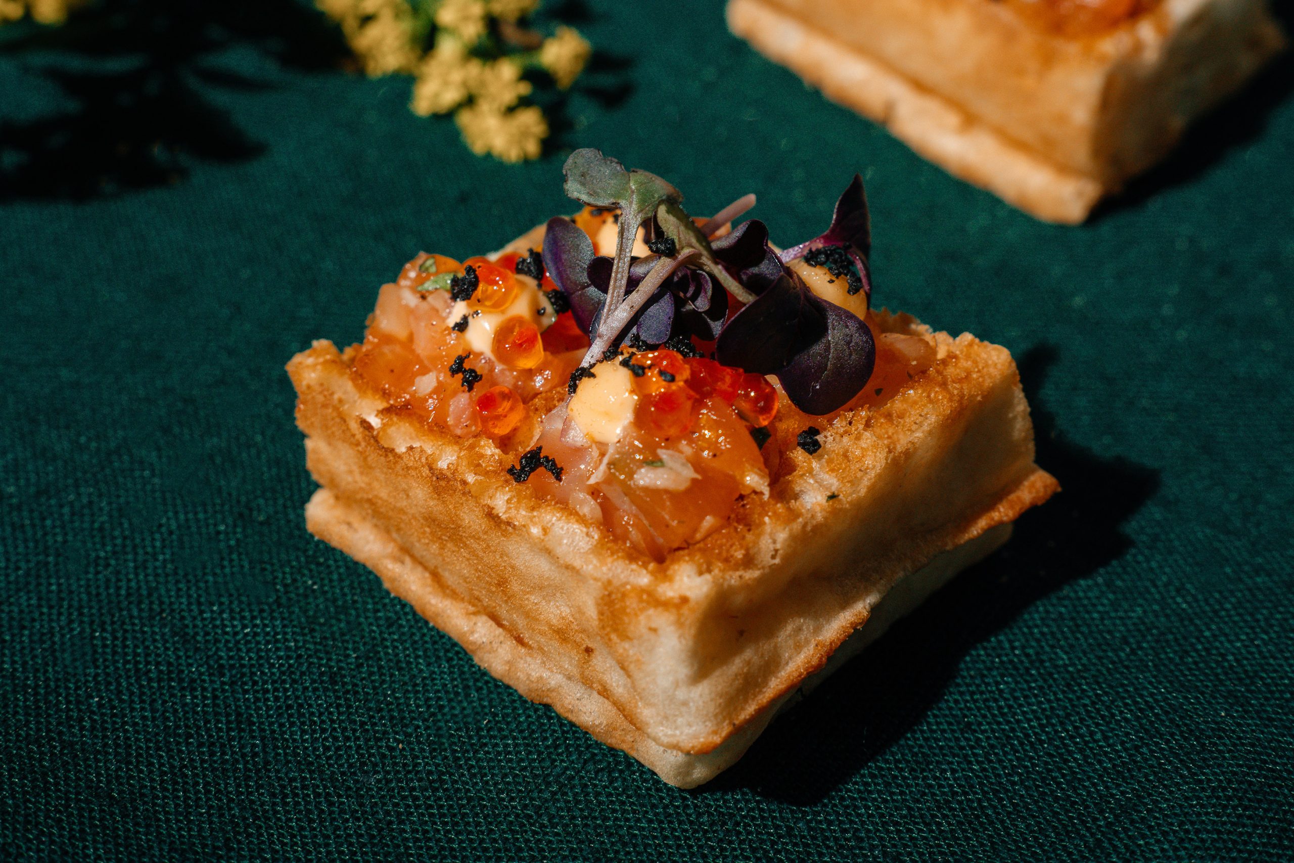Sviestinis vaflis, citrusinis lašišos tartaras, naminis kimči majonezas, upėtakio ikrai, mikrožalumynai