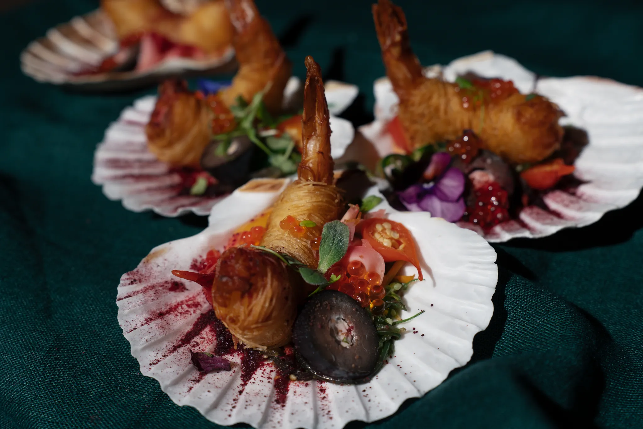 Tigrinė krevetė traškioje kataifi tešloje pateikta su wakame salotomis, sepiju rašalo kremu ir skiltele žaliosios citrinos